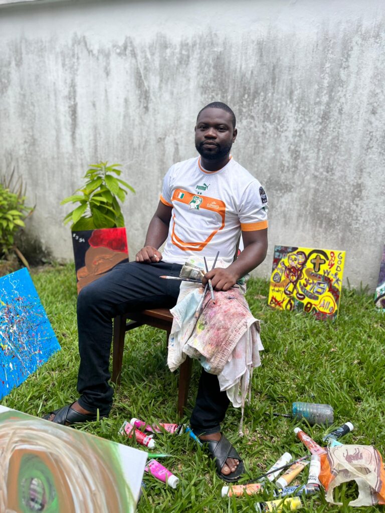 « J’explore l’art mixte, en combinant peinture acrylique, pigments naturels, charbon, clous de girofle, collages et bombes aérosol. Mon univers est abstrait et urbain, avec des influences qui rappellent parfois les graffitis de rue. J’aime cette liberté d’expression qu’offre le mélange des matières et des textures : chaque œuvre devient un espace d’expérimentation où je laisse mes émotions guider mes gestes. Je souhaite développer ma notoriété au-delà des frontières ivoiriennes, collaborer avec des galeries internationales et contribuer activement au rayonnement de l’art africain contemporain », a ajouté l’artiste plasticien ivoirien.