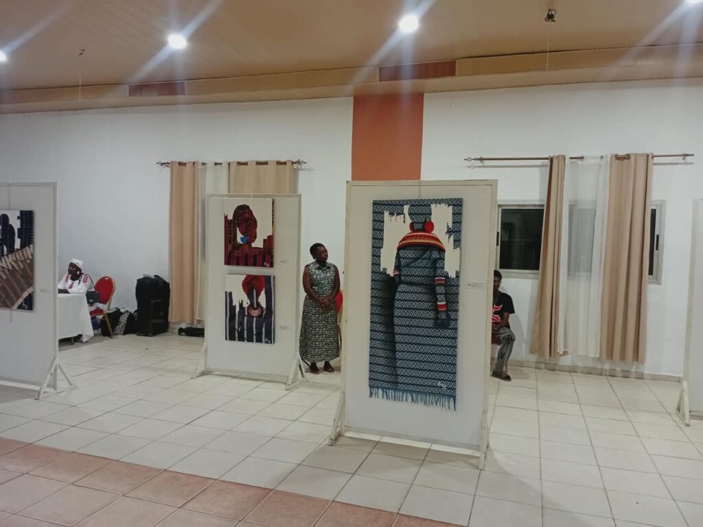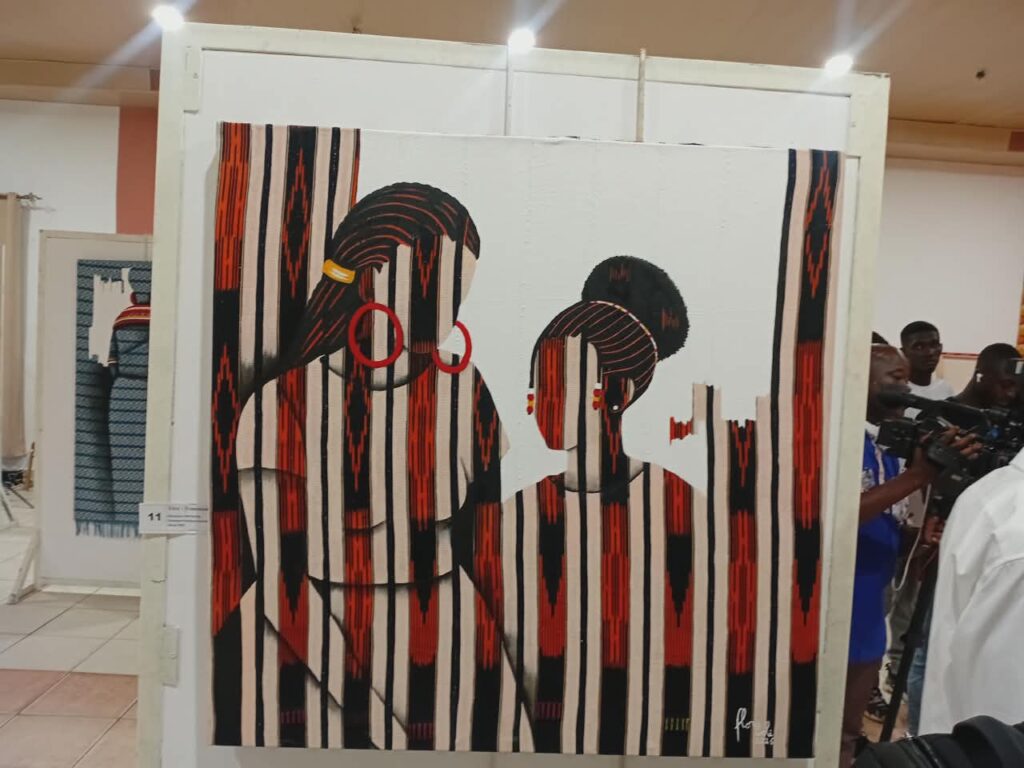 Au cœur de cette exposition, la signature singulière de Flora Goli a captivé le public : le collage de pagnes tissés directement sur la toile. Selon elle, le pagne n’est pas qu’un simple ornement, c’est une archive vivante. En intégrant des fragments de textile Baoulé et d’autres fibres artisanales, l’artiste crée un pont entre plusieurs générations.