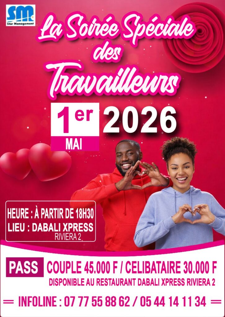 Un dîner gala, pas comme les autres, se déroulera le 1er mai, à partir de 18h30 au restaurant Dabaly Express sis à la Riviera 2. Cette soirée spéciale, organisée le jour de la Fête du Travail, a pour but principal de rende hommage aux travailleurs. Pour cette première édition, les organisateurs ont vu grand. Ils mettront tout en œuvre afin que ce moment suscite une ambiance de détente, de convivialité et de fraternité entre les participants.